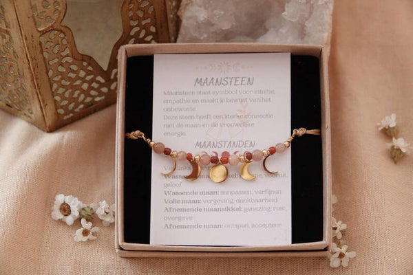 Armbandje met maansteen edelsteentjes en 5 goudkleurige maanfasen bedeltjes De edelsteentjes en kraaltjes zijn geregen op artistic wire zodat deze mooi in vorm blijven.