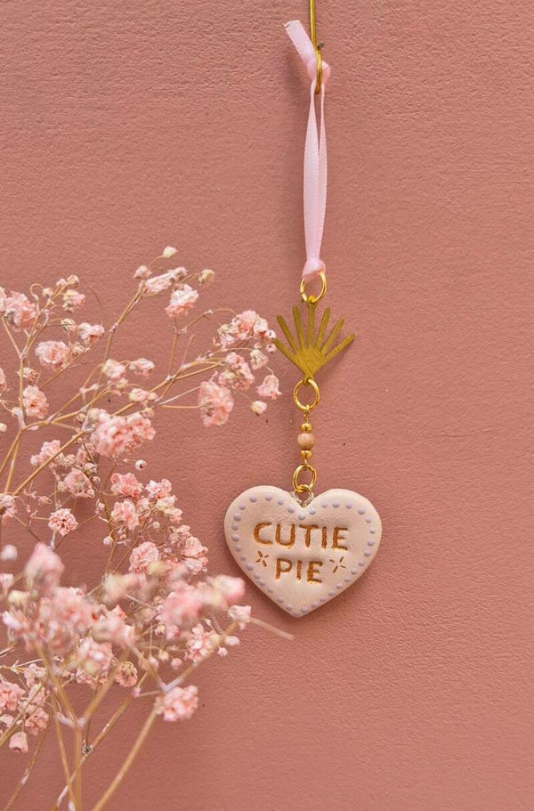 De hanger met de tekst cutie pie en love hebben aan de bovenkant een maansteen kraaltje. Maansteen staat voor vrouwelijke energie, intuïtie en zachtheid.
