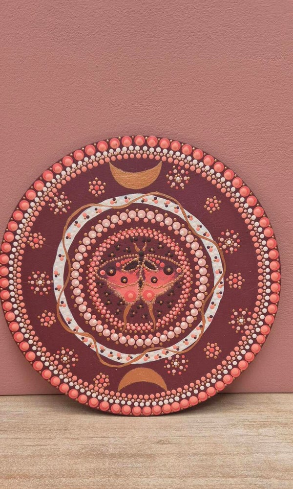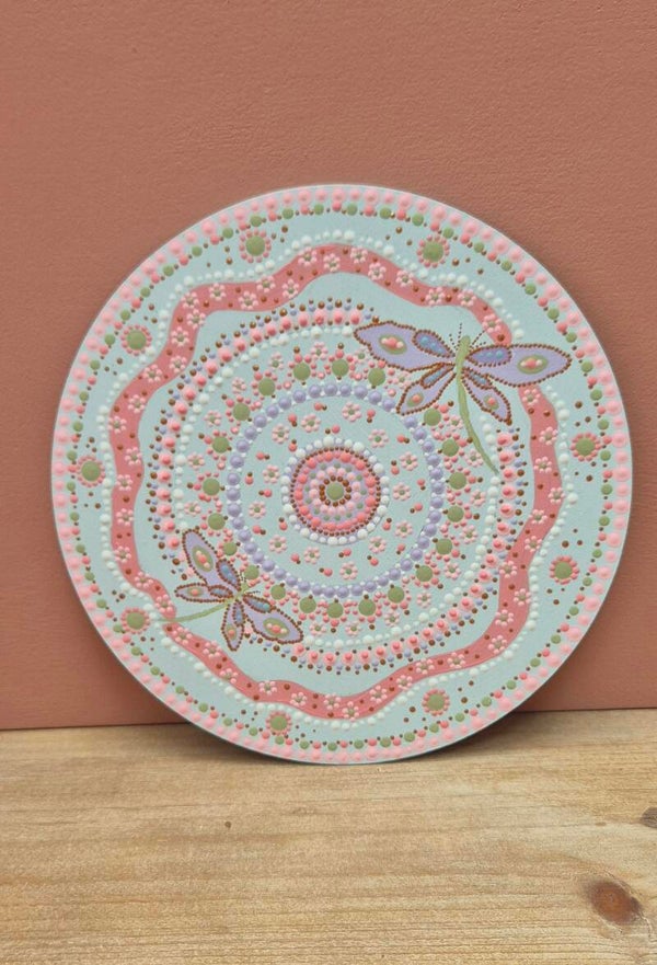 We werken op een houten bord waar we eerst de mandala op gaan uitzetten. Je hebt dan een vast stramien wat je kan helpen een patroon te creëren. Binnen deze workshop maken we gebruik van dotpainting. Dotpainting is een kunstvorm waarbij je een patroon maakt met stippen. Deze techniek komt oorspronkelijk van de Aboriginals vandaan.