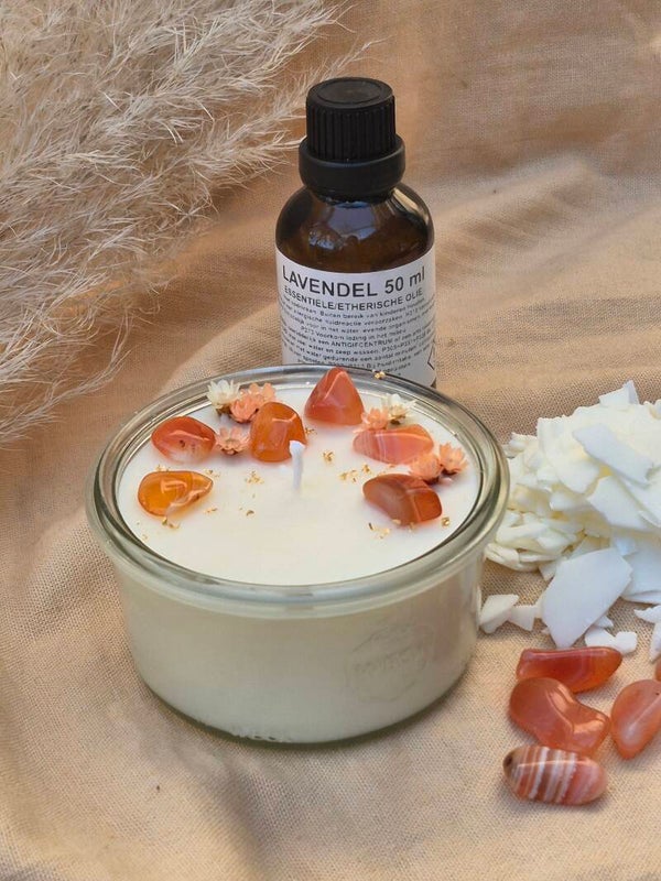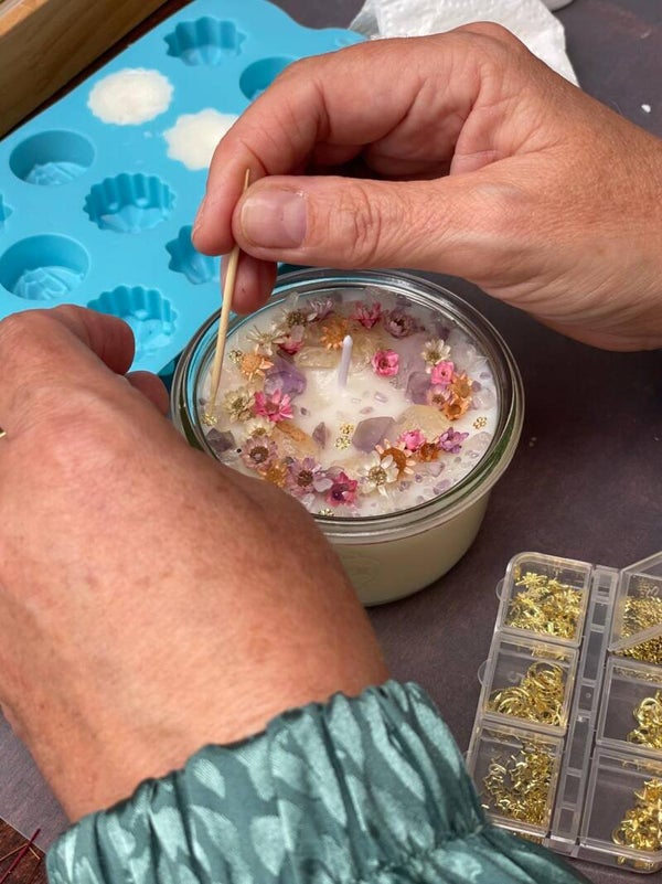 Hierna ga je zelf aan de slag met het gieten van je kaars, uitzoeken van een passende geur en het decoreren van de kaars met edelstenen.