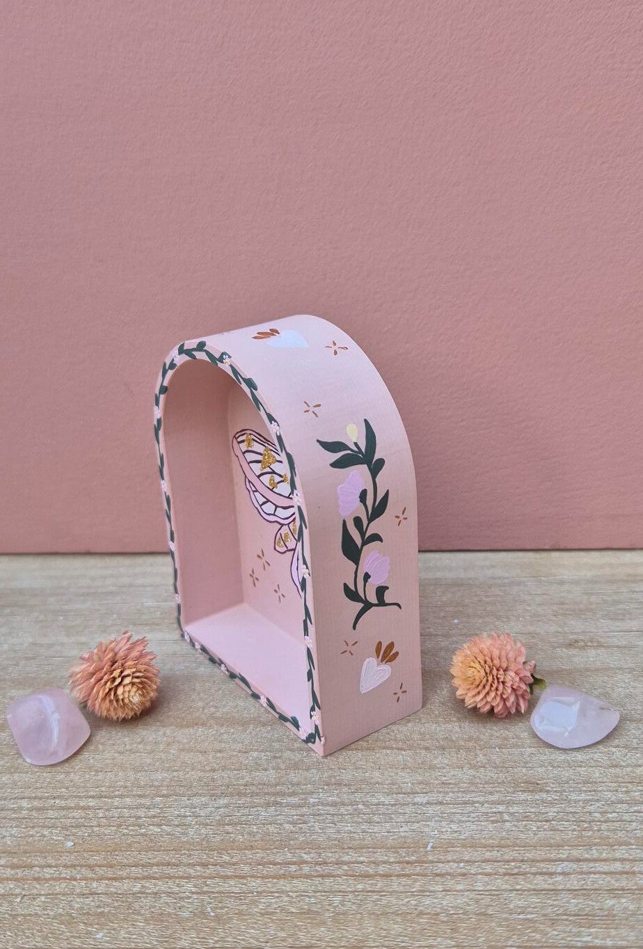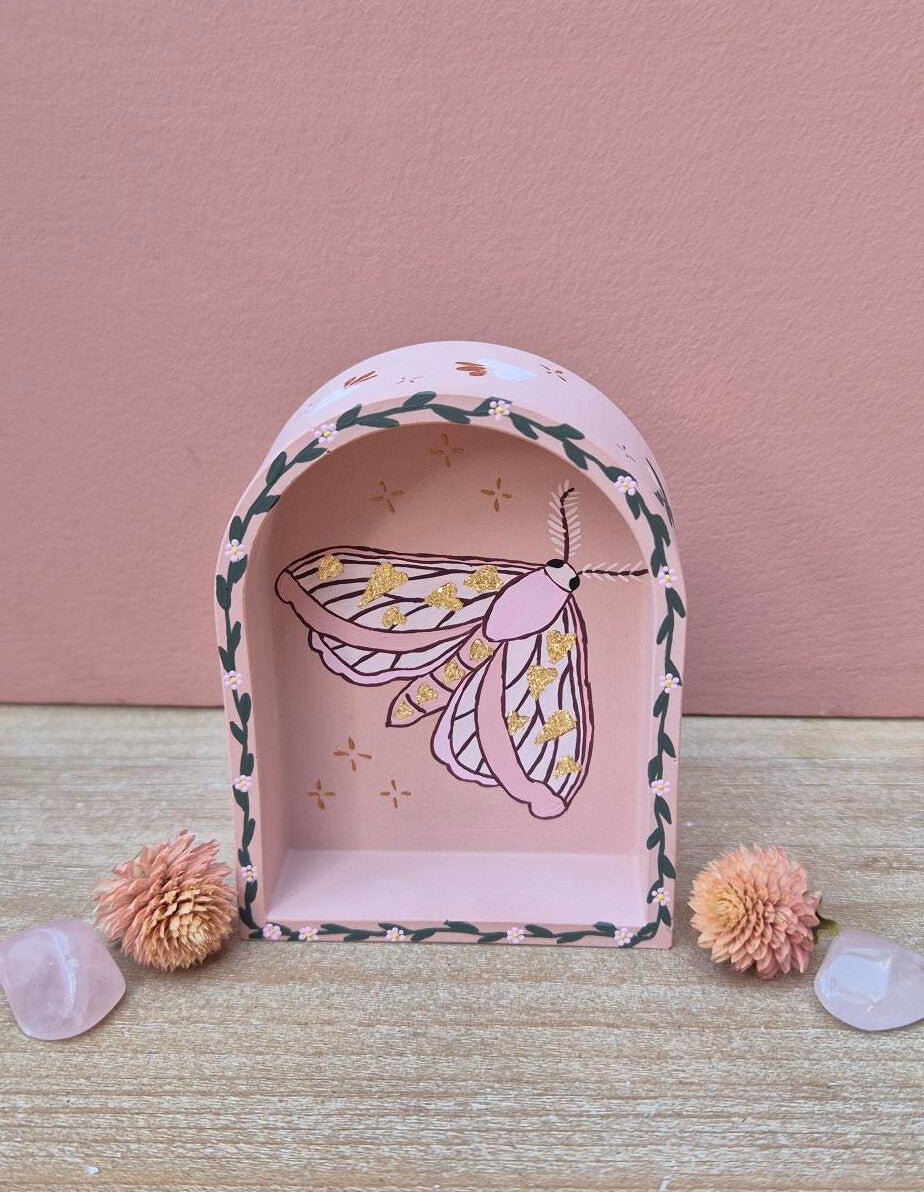 Deze mot nodigt uit om verandering niet te vrezen, maar te omarmen met een open hart. Zij staat voor stille groei, voor het loslaten van oude lagen en het durven vertrouwen op wat van binnenuit wil ontstaan. Ook staat de roze mot symbool voor kwetsbare kracht, intuïtie en het geloof dat zelfs in het donker schoonheid te vinden is.
