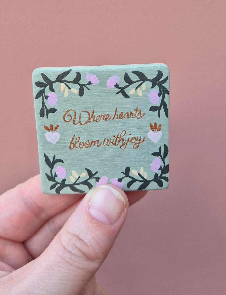 Deze handbeschilderde keramiektegel is een viering van liefde, vreugde en verbinding. Geïnspireerd op de The Wonders of Love collectie, straalt elk detail warmte en positiviteit uit. Met de affirmatie “Where Hearts Bloom with Joy” brengt deze tegel een dagelijkse herinnering om liefdevolle momenten te koesteren en je hart open te houden.