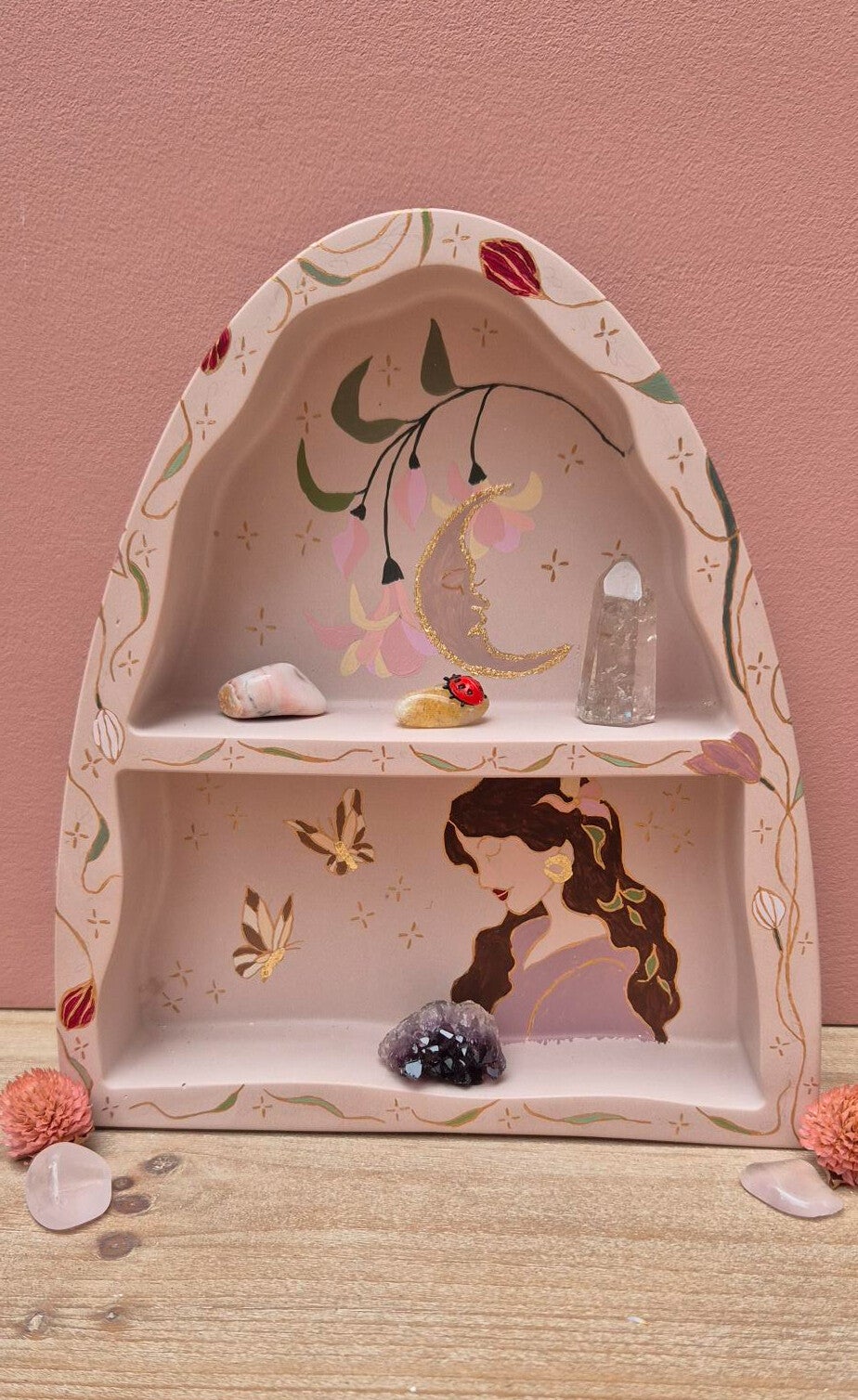Dit handgemaakte altaar is ontworpen als een stille plek voor wat je wilt koesteren. Een plek waar herinneringen mogen landen, zonder haast, zonder uitleg. Zacht aanwezig in het dagelijks leven, als een anker van rust en betekenis.