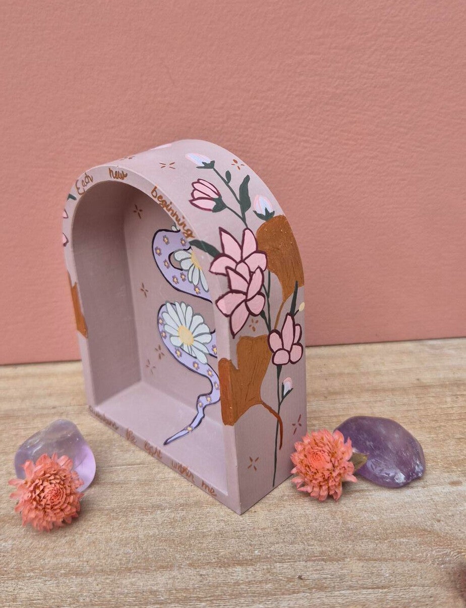 De slang staat voor transformatie. Voor het loslaten van wat niet langer past. Voor het afleggen van oude lagen, net zoals zij haar huid achterlaat om opnieuw geboren te worden. Zij herinnert je eraan dat groei een natuurlijk ritme is.